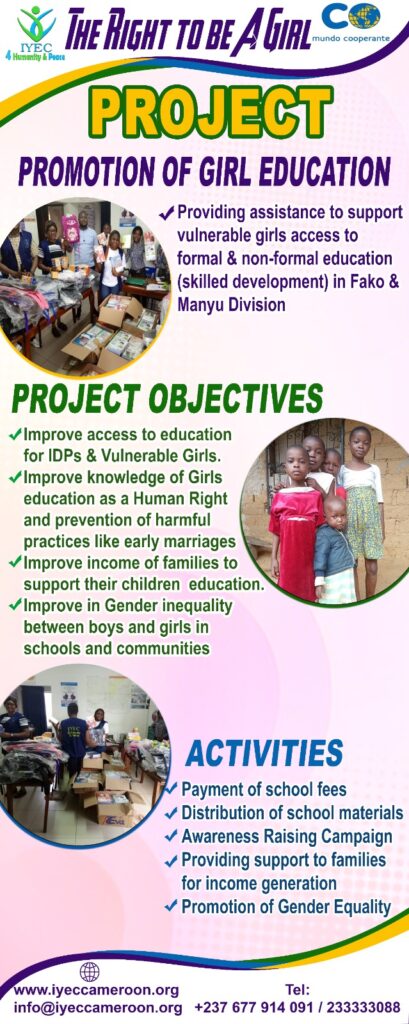 THE RIGHT TO BE A GIRL PROJECT: IYEC in partnership with Mundo Cooperante Spain is implementing a project to Promote Girls Education in order to prevent Early and Force Marriages in Communities of Cameroon. The project is providing School materials support to 100 vulnerable and displace Girls, School fees support to 60 Girls in primary and secondary schools, Support for 20 Girls to benefit from Vocational training , Support for 20 families to start income Generating activities in order to promote Girls Education. The project is also promoting Gender Equality in Schools and communities among Boys and Girls.